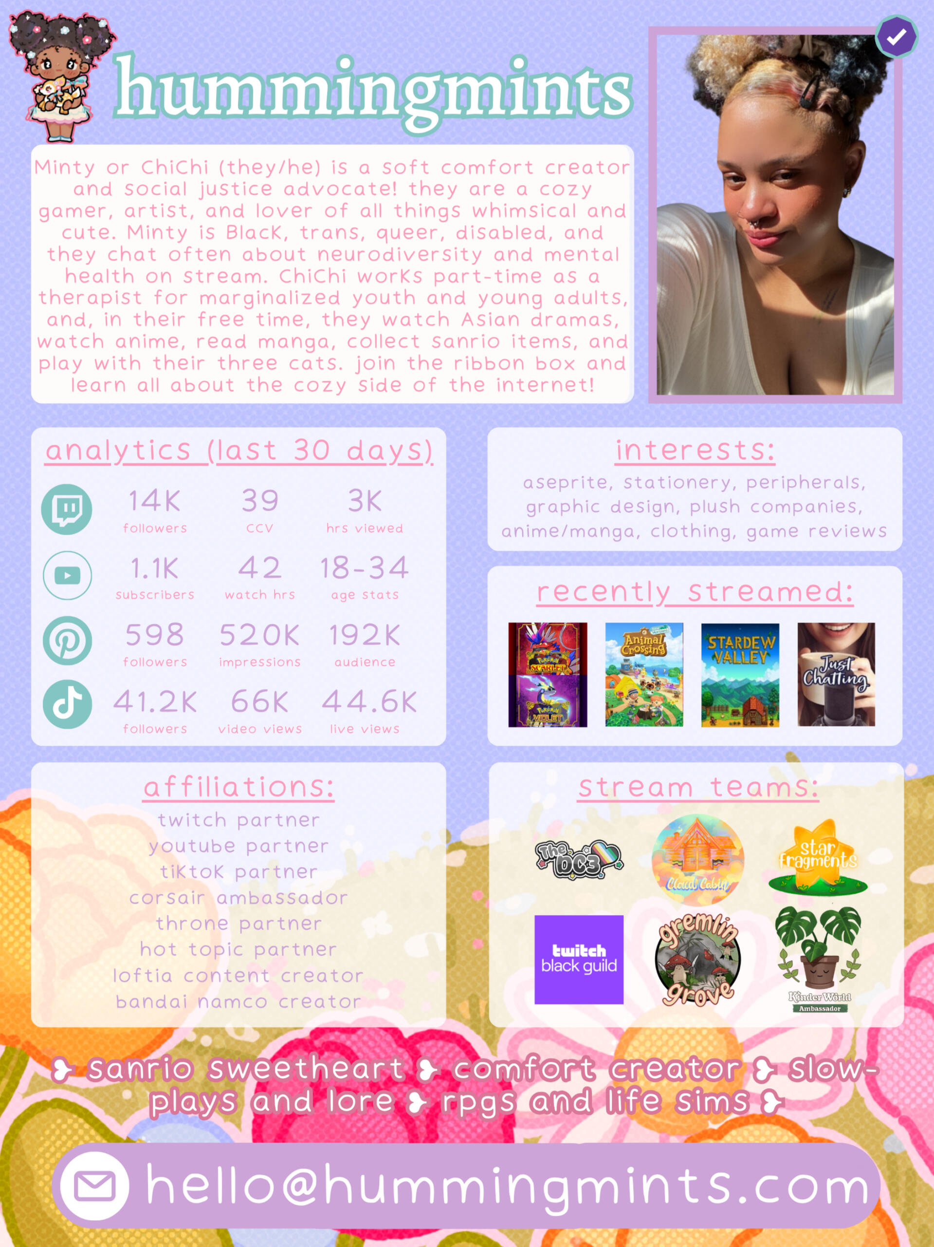 hummingmints and their ribbons understand, value, and appreciate the aesthetics of gaming. ChiChi's platform was built off of comfort gaming, much of which includes building a cozy space with soft plushies, bright lighting, and sensory-friendly music and alerts that anyone can relax, work, and even sleep to. ChiChi is always looking for new plushies and accessories to add to their set up, so please reach out if you're interested in collaborating!This is reflected in ChiChi's gaming style, with many new and old psoybeans noting that ChiChi's game matches their background. This is thanks to the time ChiChi spends curating their mods lists over the last few years. Did you know? Some of ChiChi's mods were even made by ChiChi himself! You can check them out below!
